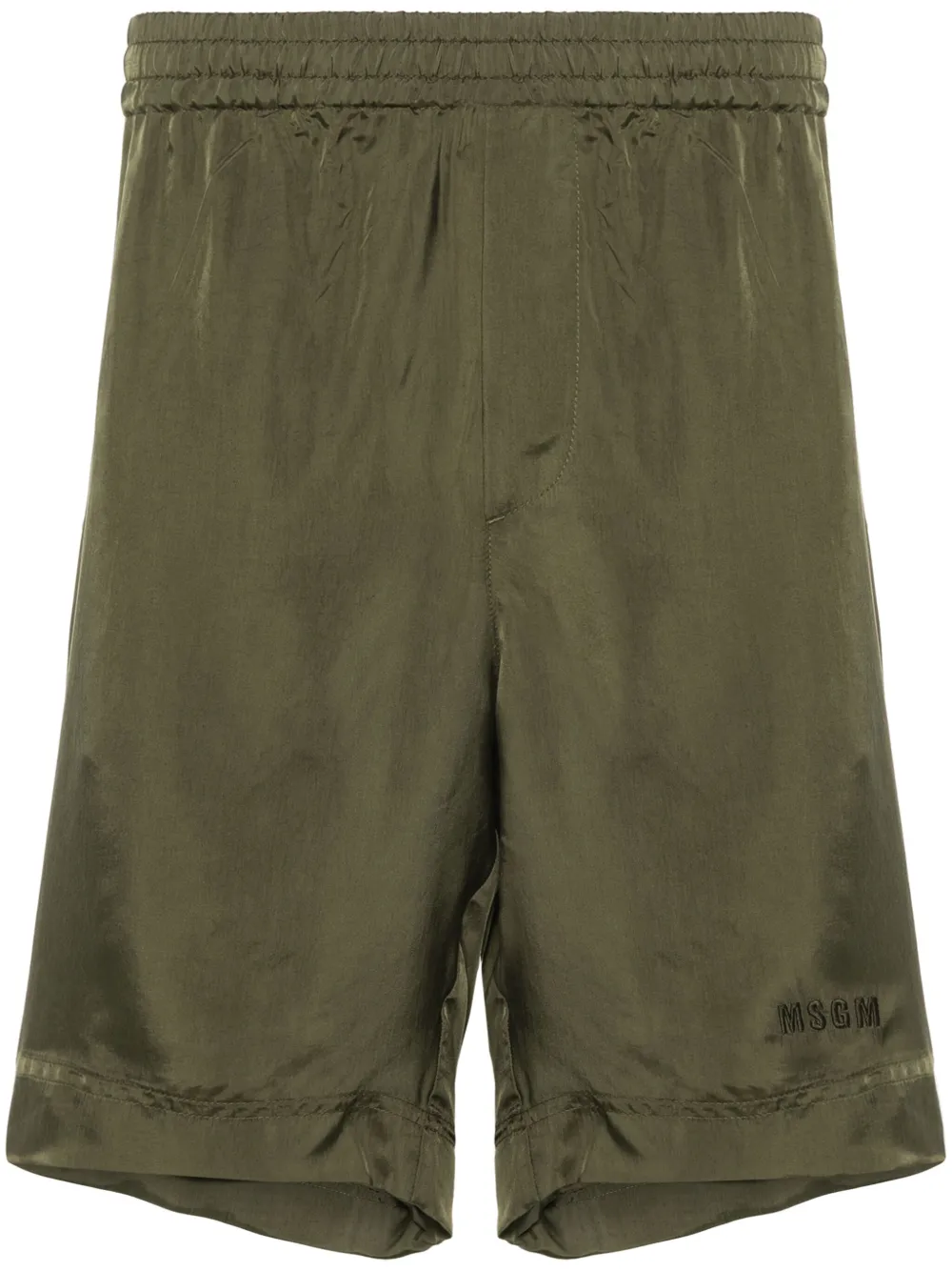 kaki fini satiné structure légère ceinture élastique poches latérales fendues logo brodé sur le devant poche arrière plaquée mini étiquette logo au dos sans doublure lien de resserrage à la taille