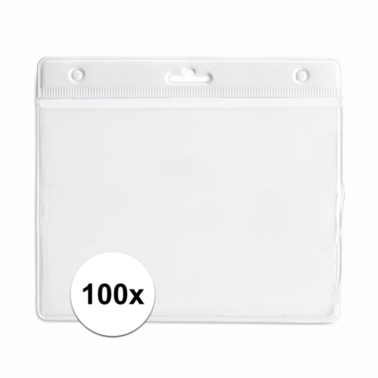 Badgehouders setje van 100x stuks in het wit. Deze badgehouders / naamkaarthouders worden veelvoudig gebruikt op beurzen, kinderfeestjes en evenementen. Formaat: ongeveer 11,5 x 9,5 cm. Let op: exclusief keycord.