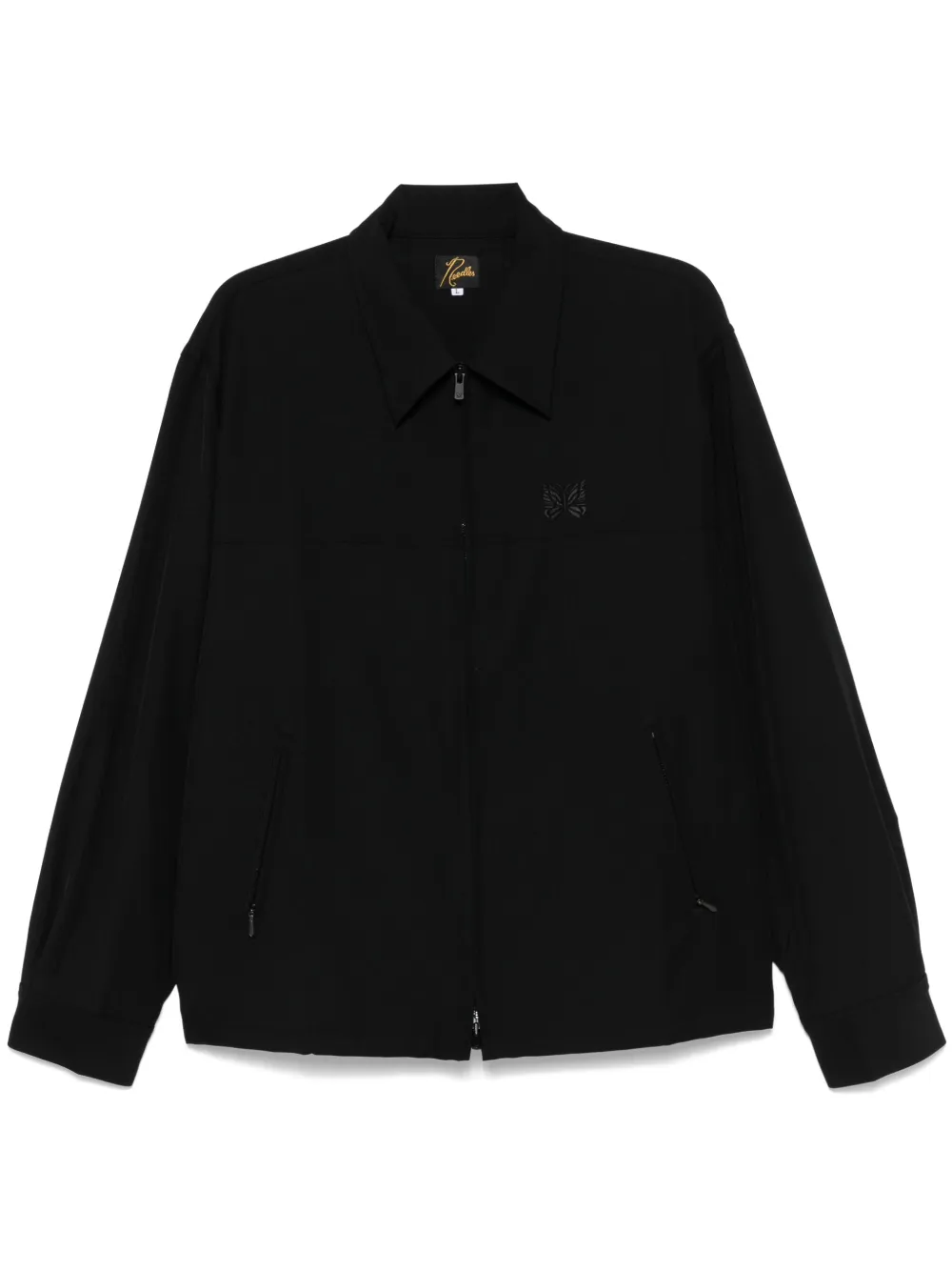 noir fermeture zippée à double sens sur le devant col classique manches longues poignets boutonnés logo brodé sur la poitrine deux poches latérales zippées plis creux ourlet élastiqué au dos