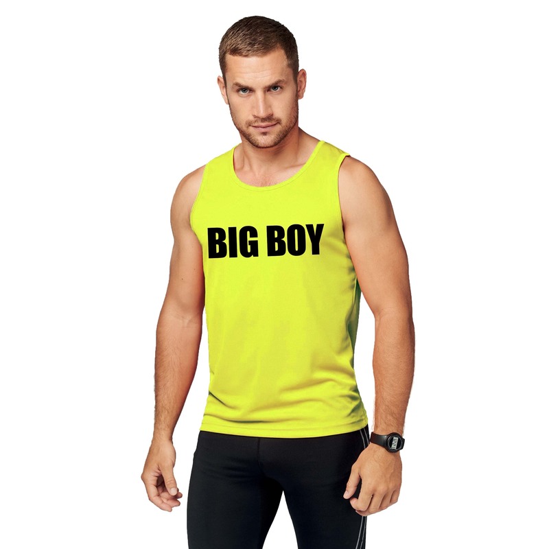 Neon geel sport shirt/ singlet Big boy voor heren. Op dit shirt staat de tekst Big boy. Dit sport shirt is van sneldrogende lichte stof. Materiaal: 100% polyester.