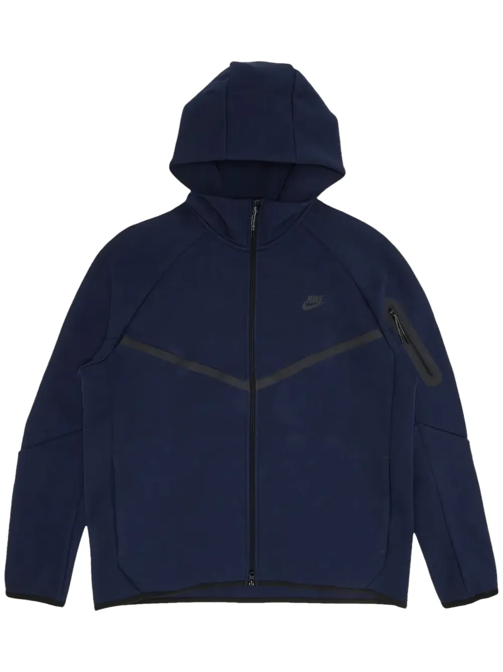 bleu nuit fermeture zippée devant capuche classique logo imprimé à la poitrine manches longues poche zippée sur la manche deux poches passepoilées latérales ourlet droit