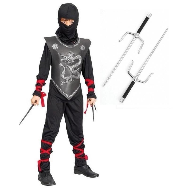 Ninja kostuum maat S met dolken voor kinderen. Dit complete ninja kostuum voor kinderen bestaat uit een shirt met borststuk, broek, ninja/bivak muts en twee speelgoed dolken.