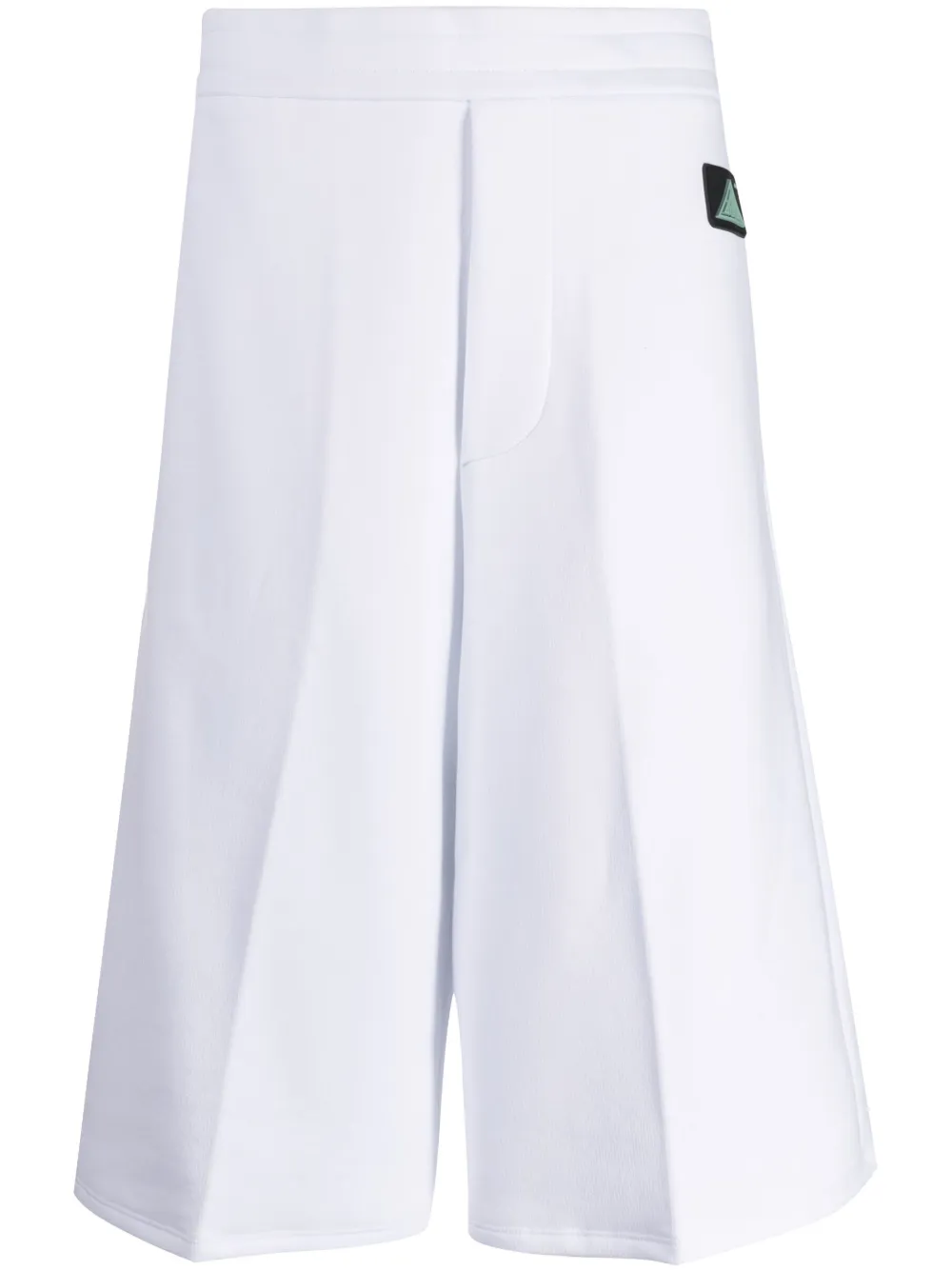 Blanc, coton, plis marqués, patch logo sur le côté, ceinture élastique, poche arrière plaquée.