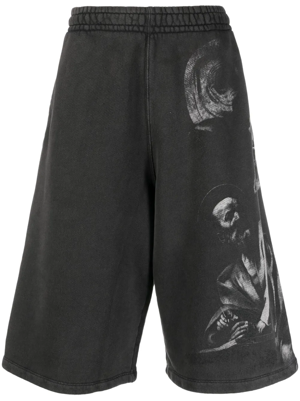 Noir, coton, imprimé graphique sur le devant, ceinture élastique, poches latérales fendues.