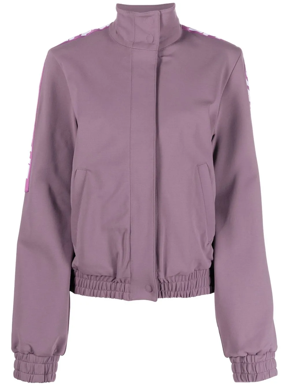 Violet, col montant, fermeture dissimulée sur le devant, poches latérales fendues, ourlet élastiqué, manches longues, poignets élastiqués.