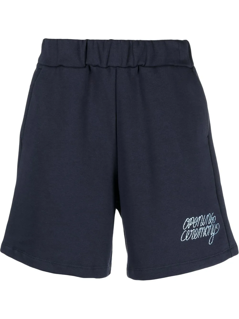 Bleu marine, coton, maille molletonnée, logo brodé sur le côté, taille élastique à lien de resserrage, poches plaquées latérales, coupe courte.