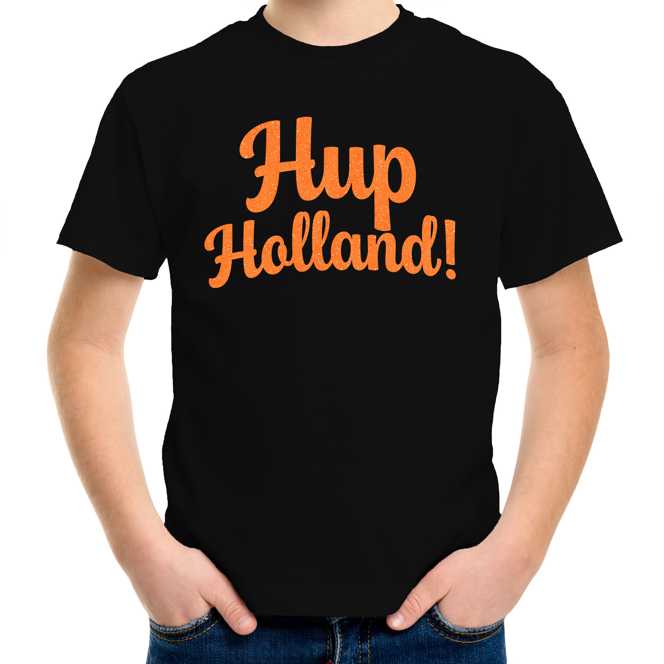 Oranje supporter T-shirt voor jongens in de kleur zwart met oranje glitter bedrukking. Het shirt is bedrukt met de tekst: Hup Holland! Heb je binnenkort een EK/WK voetbal wedstrijd of een ander sport evenement waarbij je Nederland wil aanmoedigen? Dan is dit T-shirt de perfecte keuze! Support Nederland met dit bedrukte shirt. Ook leuk om te dragen naar een themafeestje, koningsdag of gewoon zomaar. Materiaal: 145 grams, 100% katoen. Merk: Bellatio Decorations.