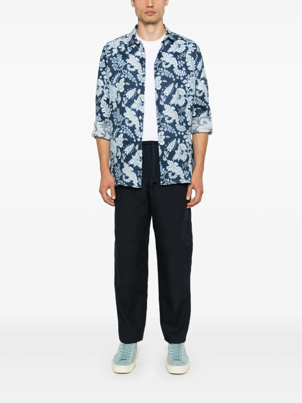 middernachtblauw linnen/vlas toelopende pijpen elastische tailleband met trekkoord twee ingenaaide zijzakken twee paspelzakken aan de achterkant verborgen rits-, haak- en knoopsluiting aan de voorkant