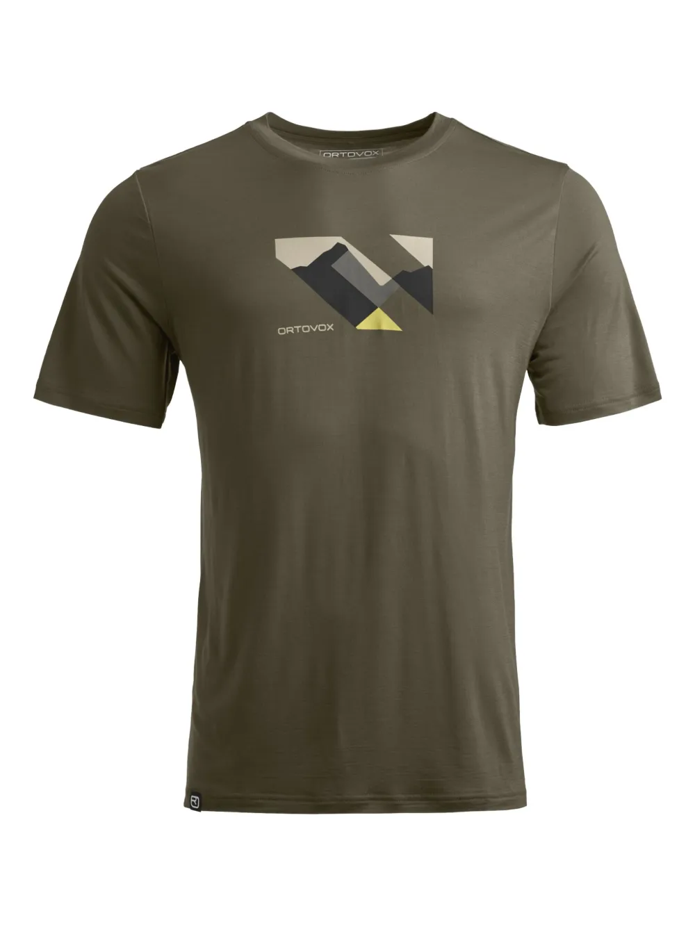 vert olive manches courtes col rond imprimé graphique motif montagne placement central