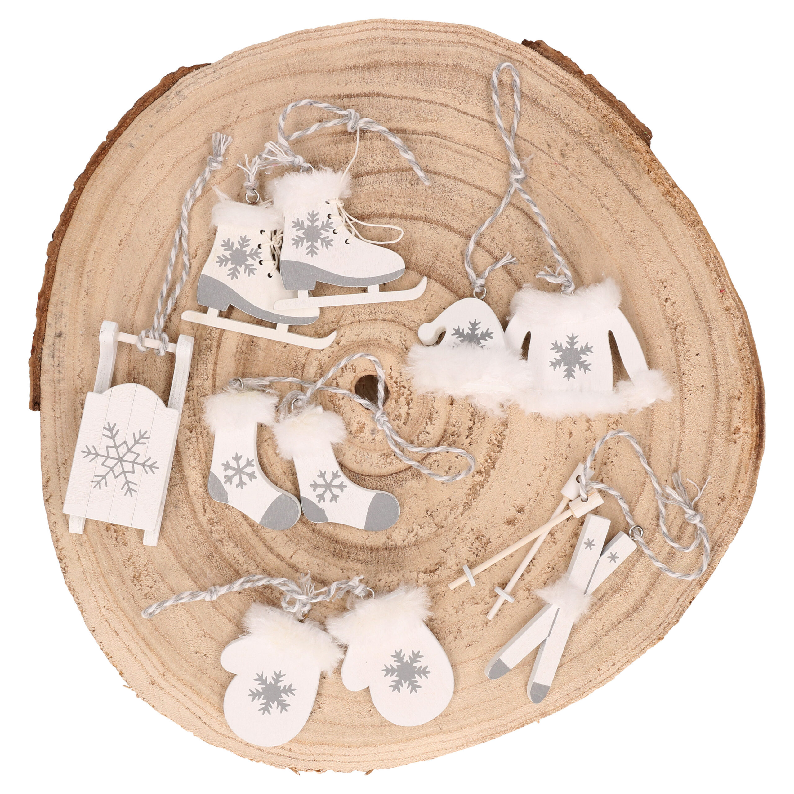 Deze set van 6x stuks kersthangers in wintersport thema is een perfecte manier om de kerstboom een unieke en leuke look te geven. De kerstornamenten zijn gemaakt van hout, wit van kleur en hebben een formaat van ongeveer 8 cm. Diverse kersthangers zoals schaatsen, handschoenen, sleetjes. Kerstboomversiering/kerstversiering kersthanger.