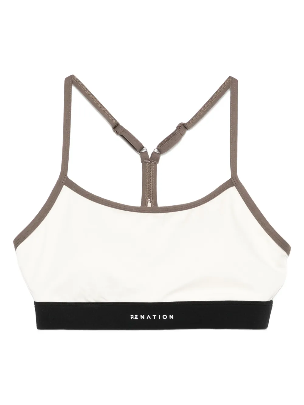 blanc cassé dos nageur bordure marron fermeture zippée ourlet élastiqué détail de logo