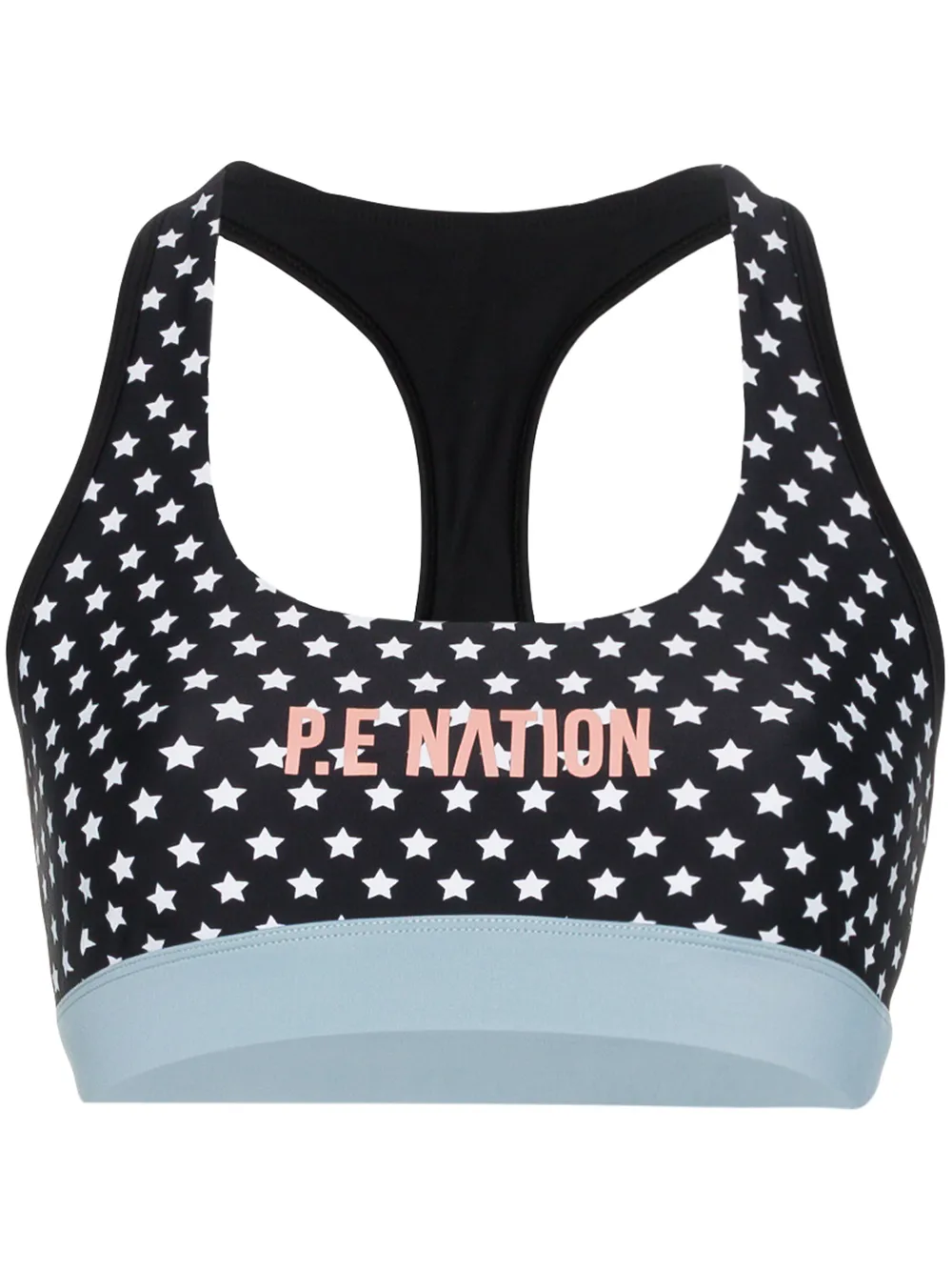 Brassière de sport Dominion P.E Nation avec décolleté arrondi, imprimé devant, coupe stretch et bride au dos. Couleur : noir.