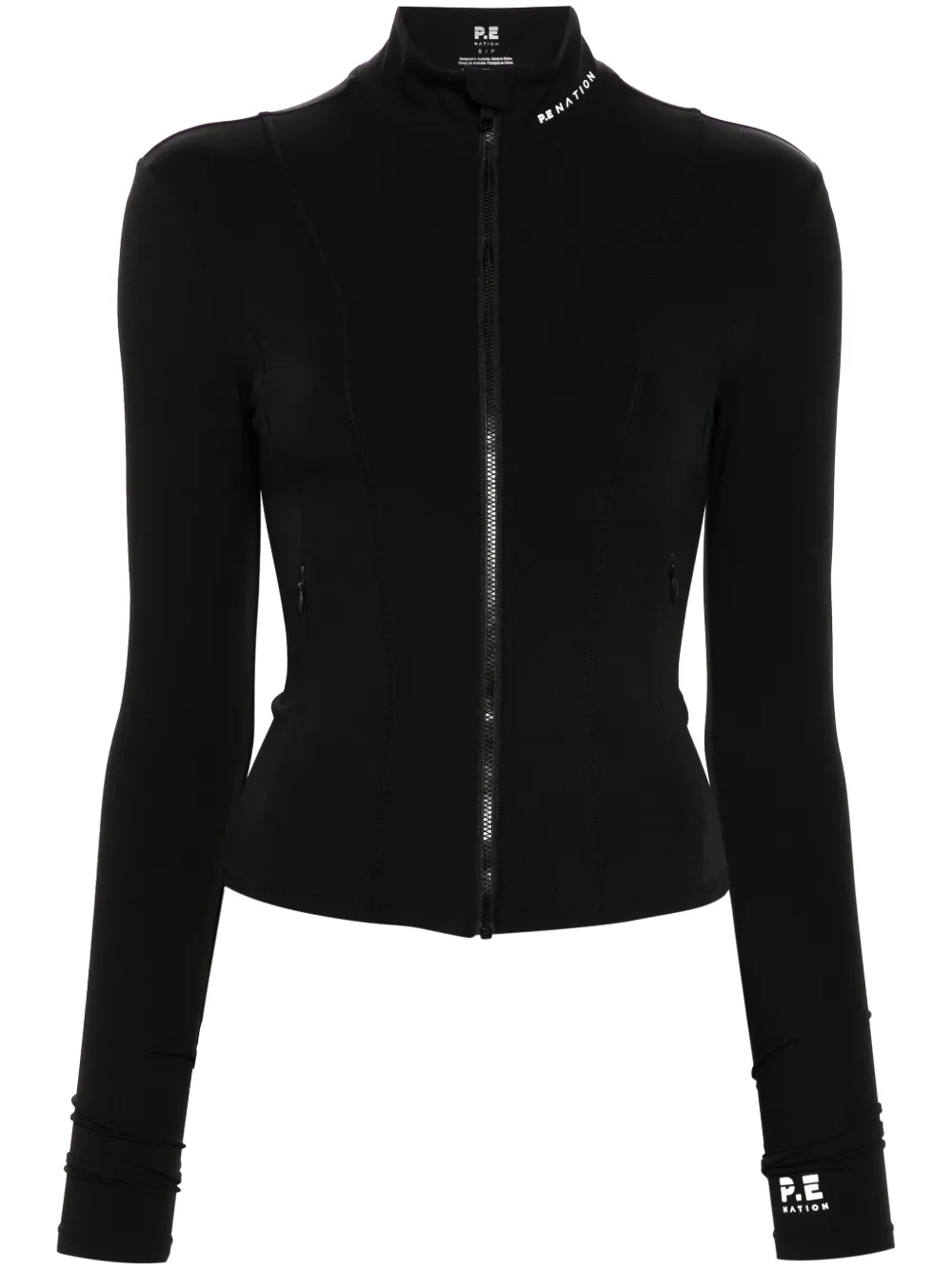 noir design stretch fermeture zippée devant col montant logo en caoutchouc manches longues poches à fermeture zippée devant ourlet droit