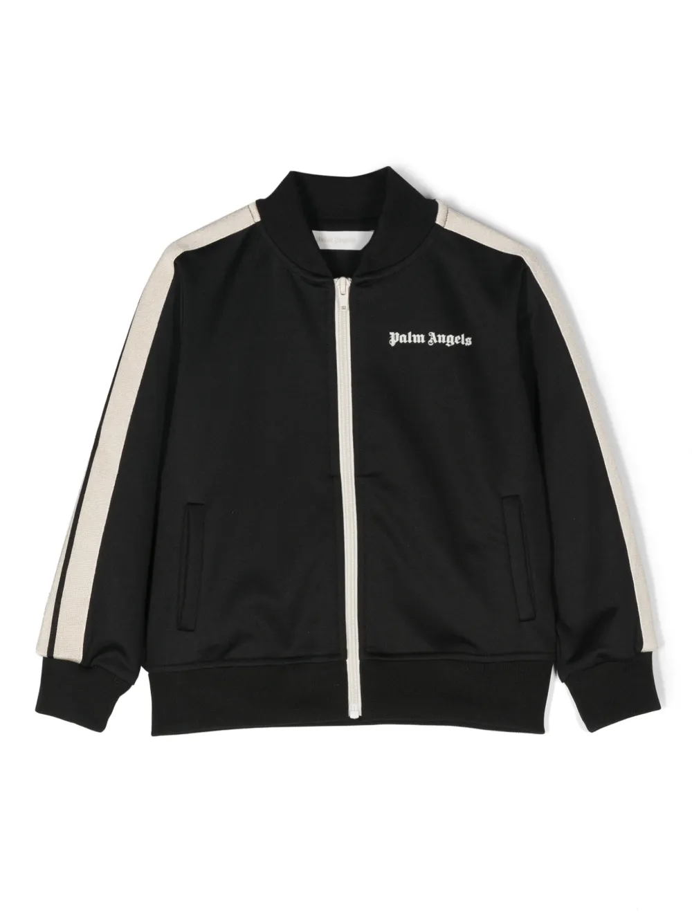 Noir, blanc cassé, coton, détail de rayure latérale, logo imprimé à la poitrine, col style baseball, fermeture zippée devant, manches longues, ourlet droit.