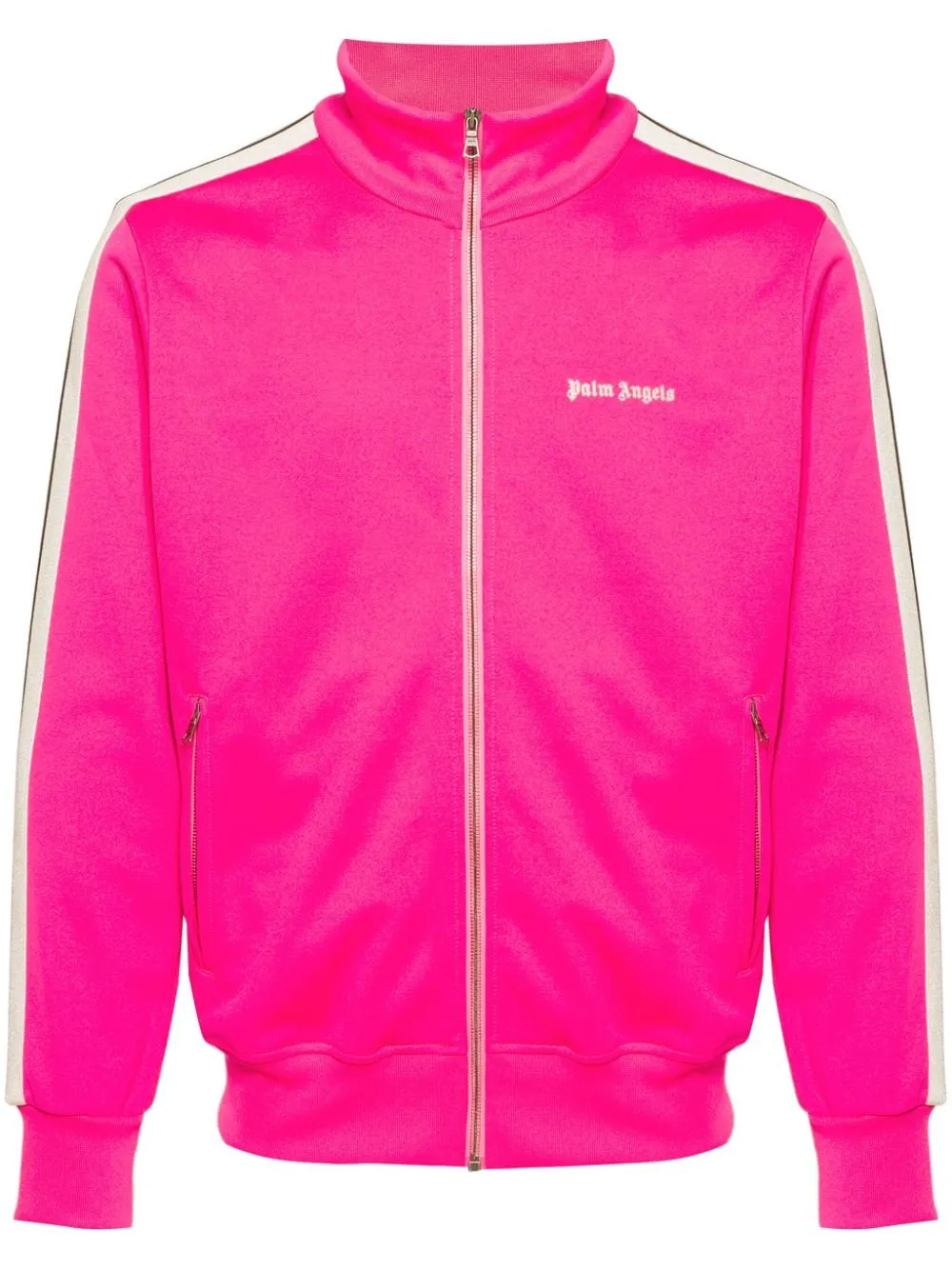rose fuchsia/beige col montant logo brodé sur la poitrine détail de rayure latérale manches longues à poignets élastiqués poches à fermeture zippée devant ourlet élastiqué fermeture zippée devant