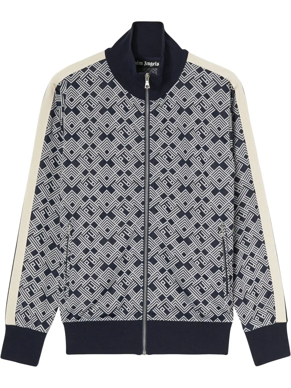 bleu marine/blanc cassé motif monogrammé col montant fermeture zippée devant manches longues détail de rayure latérale poignets nervurés ourlet droit