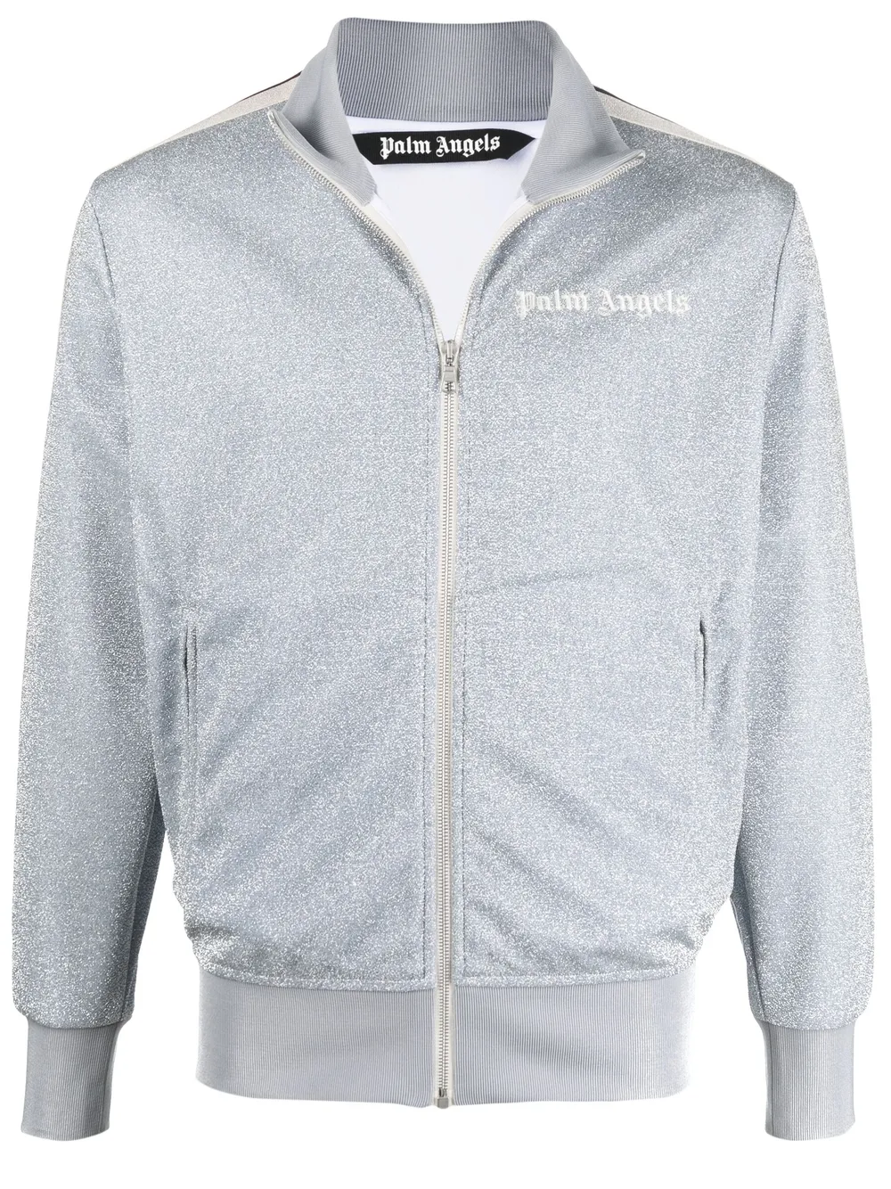 argent col montant fermeture zippée devant logo brodé poches à fermeture zippée devant bord en maille côtelée détail de rayure latérale manches longues poignets nervurés