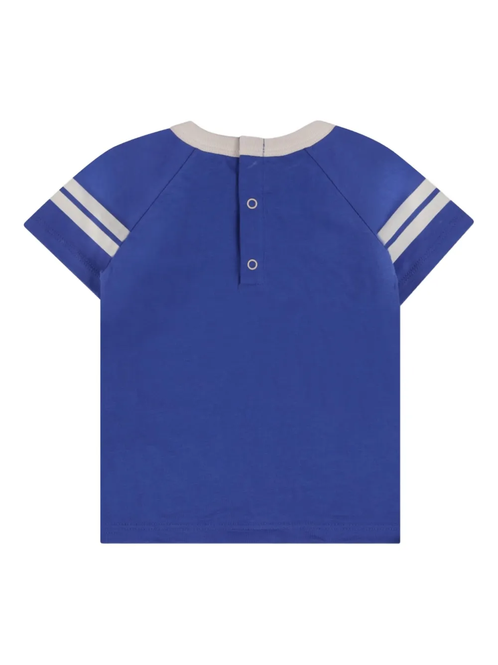 blauw raglan mouwen ronde hals Team Sport opschrift drie horizontale strepen biologisch katoen knoopsluiting aan de achterkant