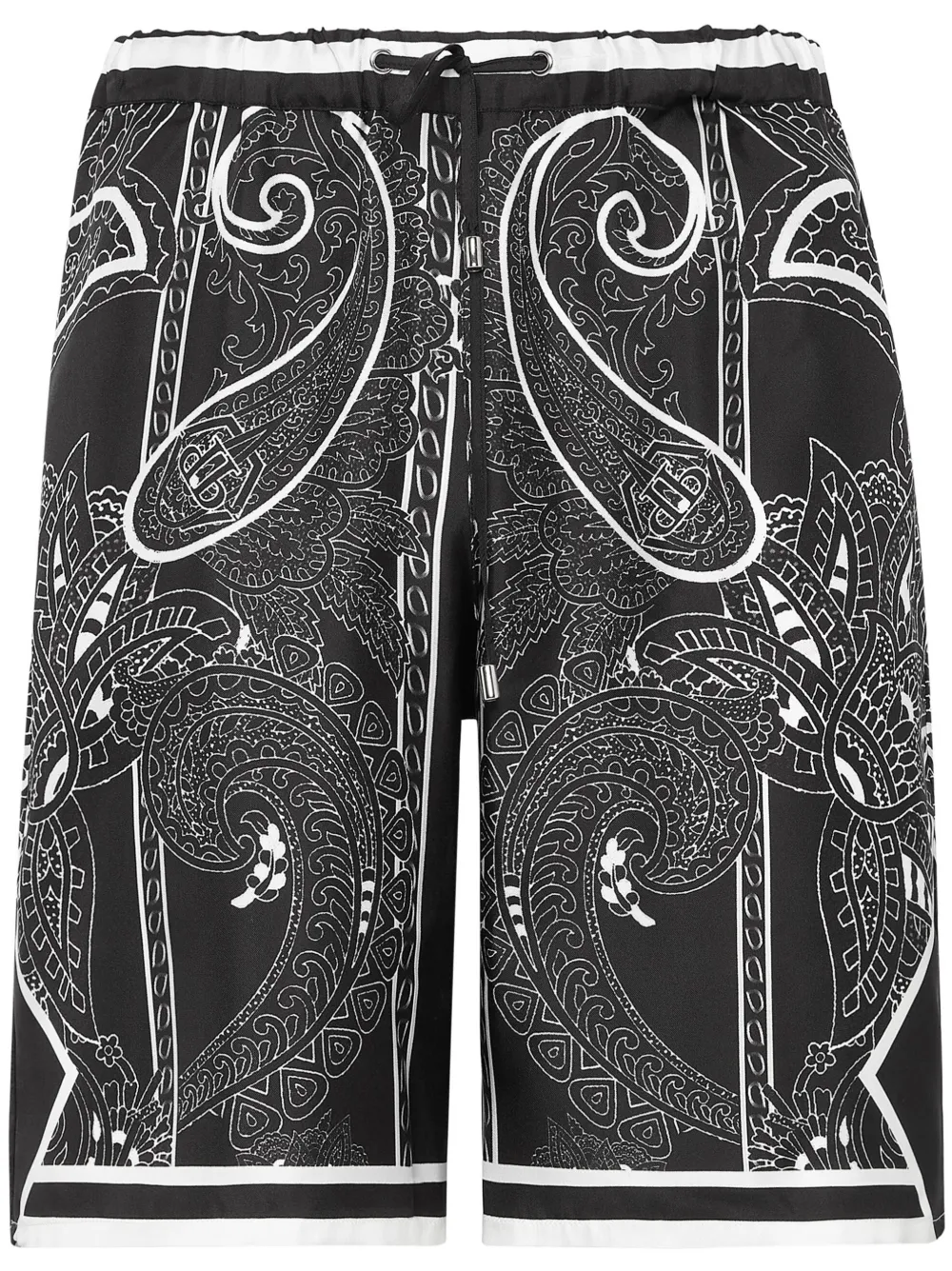 Noir/blanc, soie, motif cachemire, taille élastique à lien de resserrage, poches plaquées latérales, hauteur genou, ourlet droit.