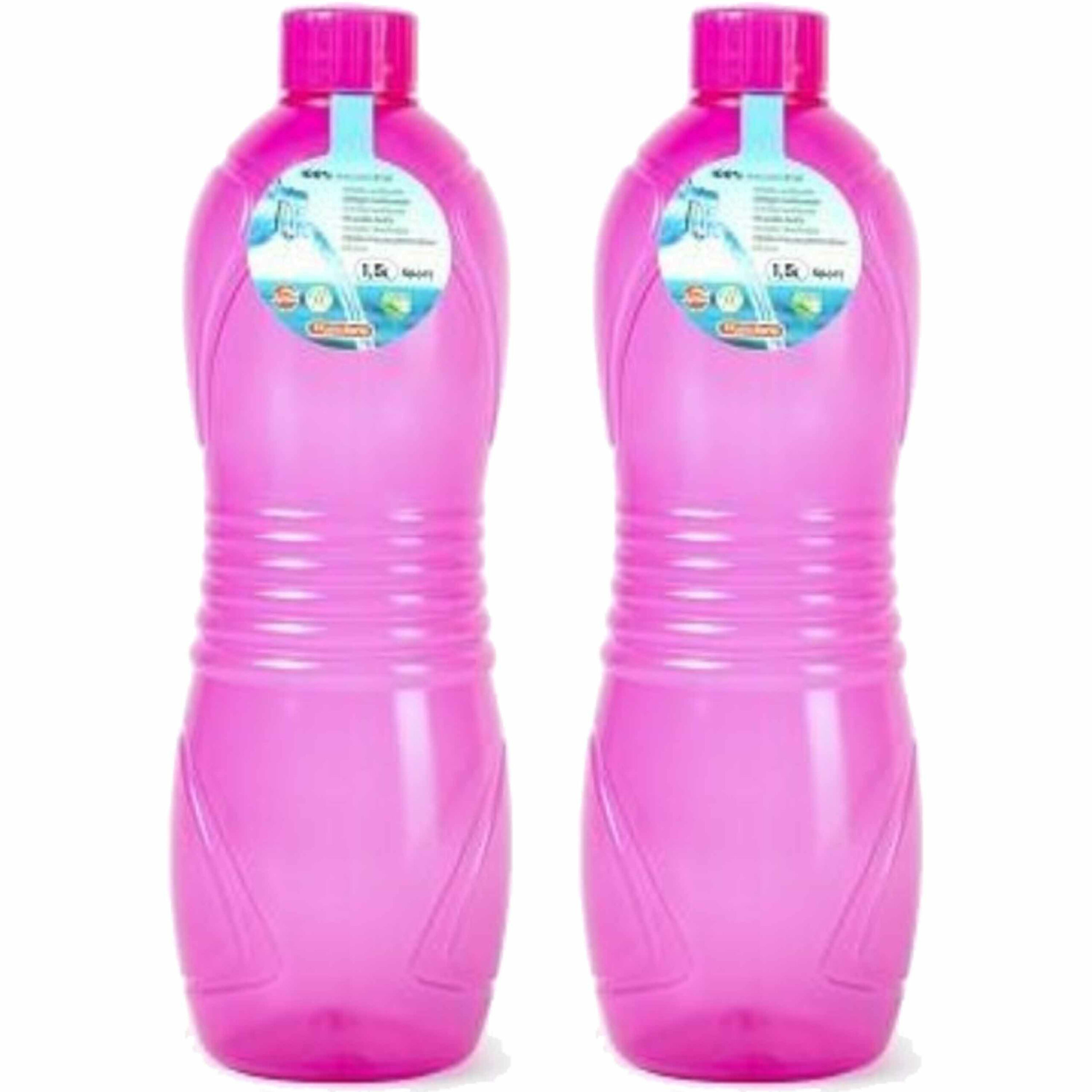 2x drinkfles/bidon/waterfles met een inhoud van 1500 ml, gemaakt van transparant kunststof met afsluitdop in het roze. Handige multifunctionele drinkfles voor sapjes en water. Voor recreatie en/of sport. Formaat: 29 x 9 cm. Kan in de vriezer en magnetron gebruikt worden.