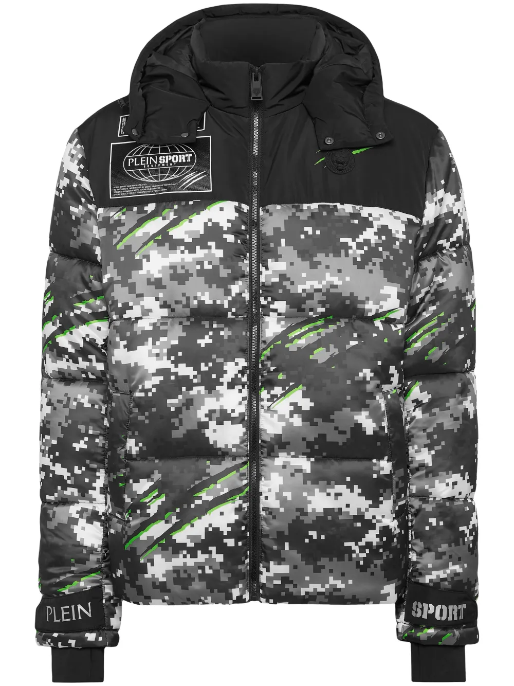 noir/blanc/gris design matelassé imprimé pixelisé fermeture zippée devant capuche classique col montant patch poitrine à logo manches longues patch logo sur les poignets nervurés logo imprimé à l’arrière ourlet droit