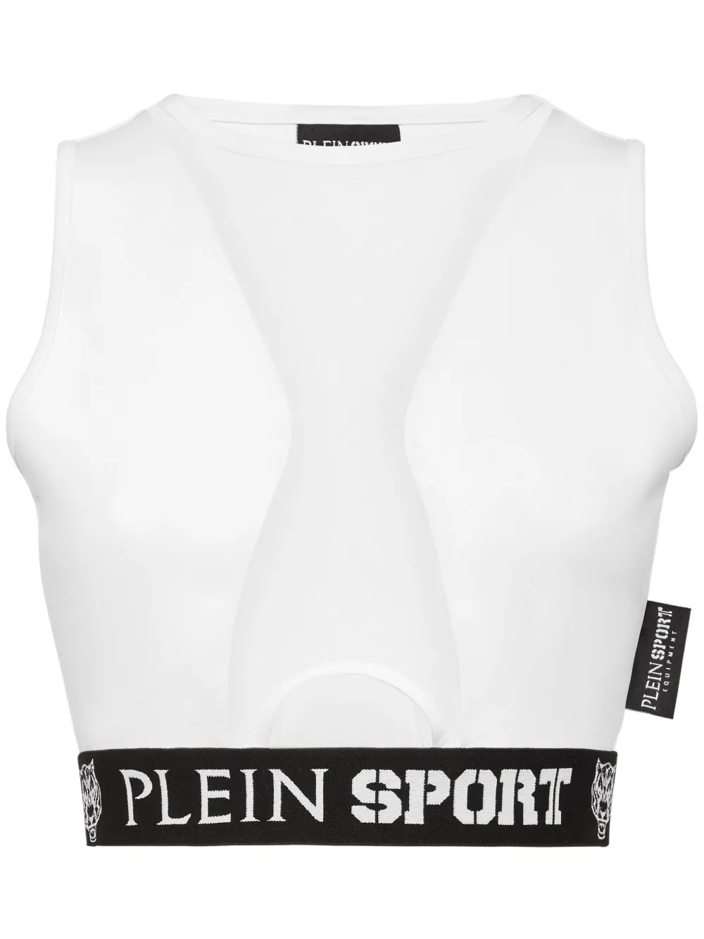 blanc/noir jersey stretch design à empiècements empiècements semi-transparents détails de découpes bande sous-poitrine à logo motif tête de tigre signature col rond design sans manches coupe crop bande sous-poitrine élastiquée ourlet droit
