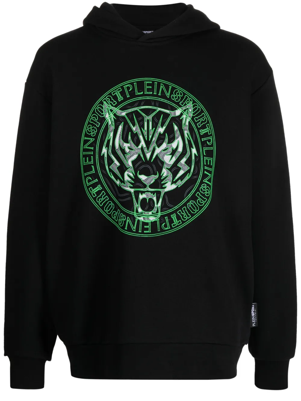 Noir, logo imprimé sur le devant, capuche souple, poche plaquée sur le devant, manches longues, ourlet droit.