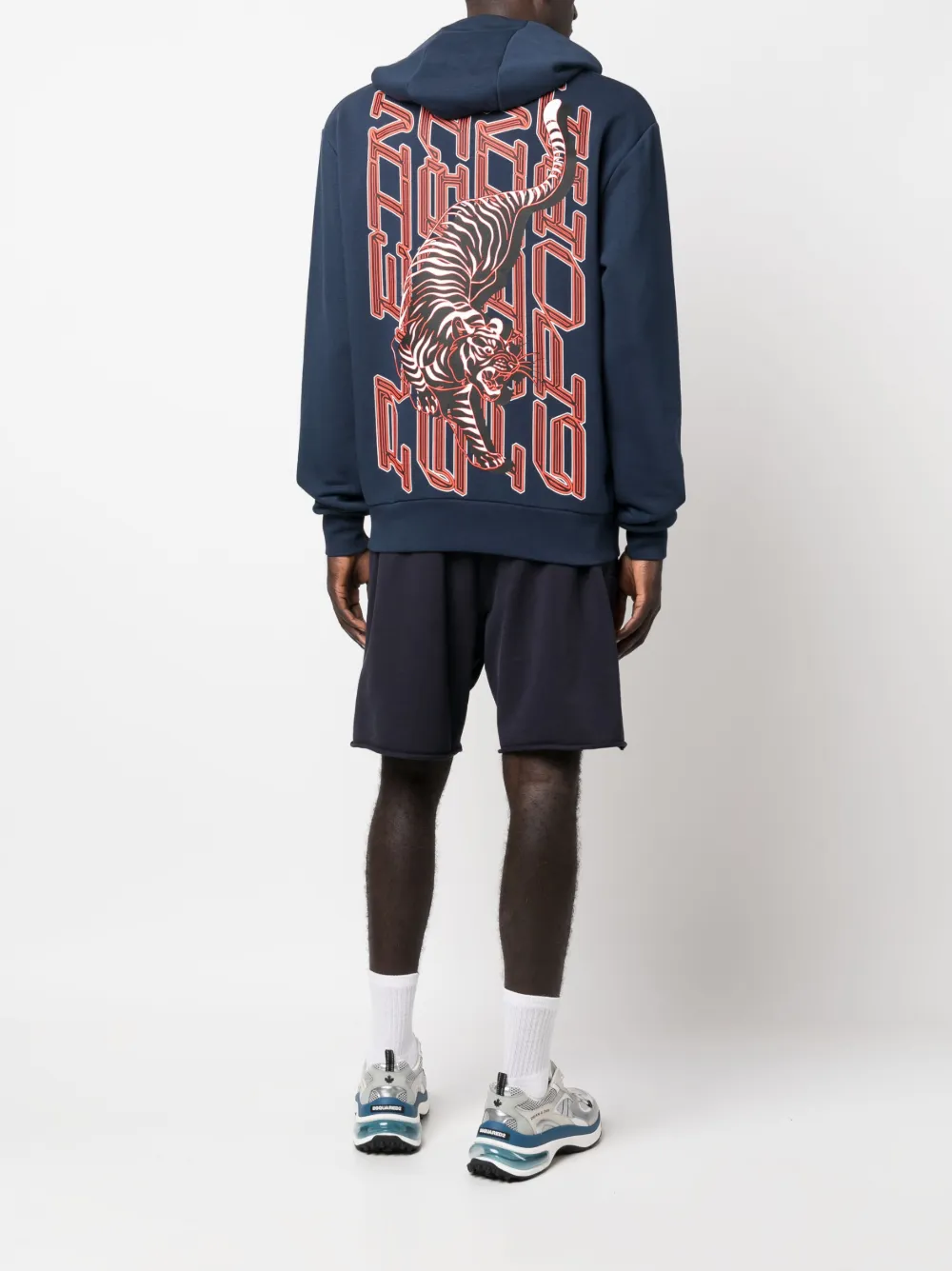 Marineblauw, baksteenrood, katoen, logoprint op de voorkant, logoprint op de achterkant, klassieke capuchon, verlaagde schouders, lange mouwen, aansluitende manchetten en rechte zoom.
