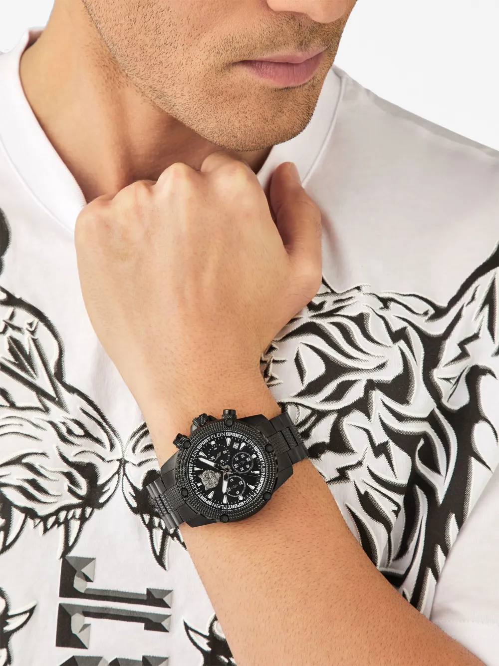 Zwart, roestvrij staal, quartz uurwerk, roestvrijstalen polsband, verborgen vlindersluiting, kenmerkend Tiger patroon, spike stud-detail, ronde wijzerplaat, baton wijzers, index wijzerplaat, stopwatchfunctie, twee chronografische drukkers, datumaanduiding en waterdichtheid tot 50 m/5 ATM. Dit item wordt bezorgd met standaard twee jaar garantie van het merk.