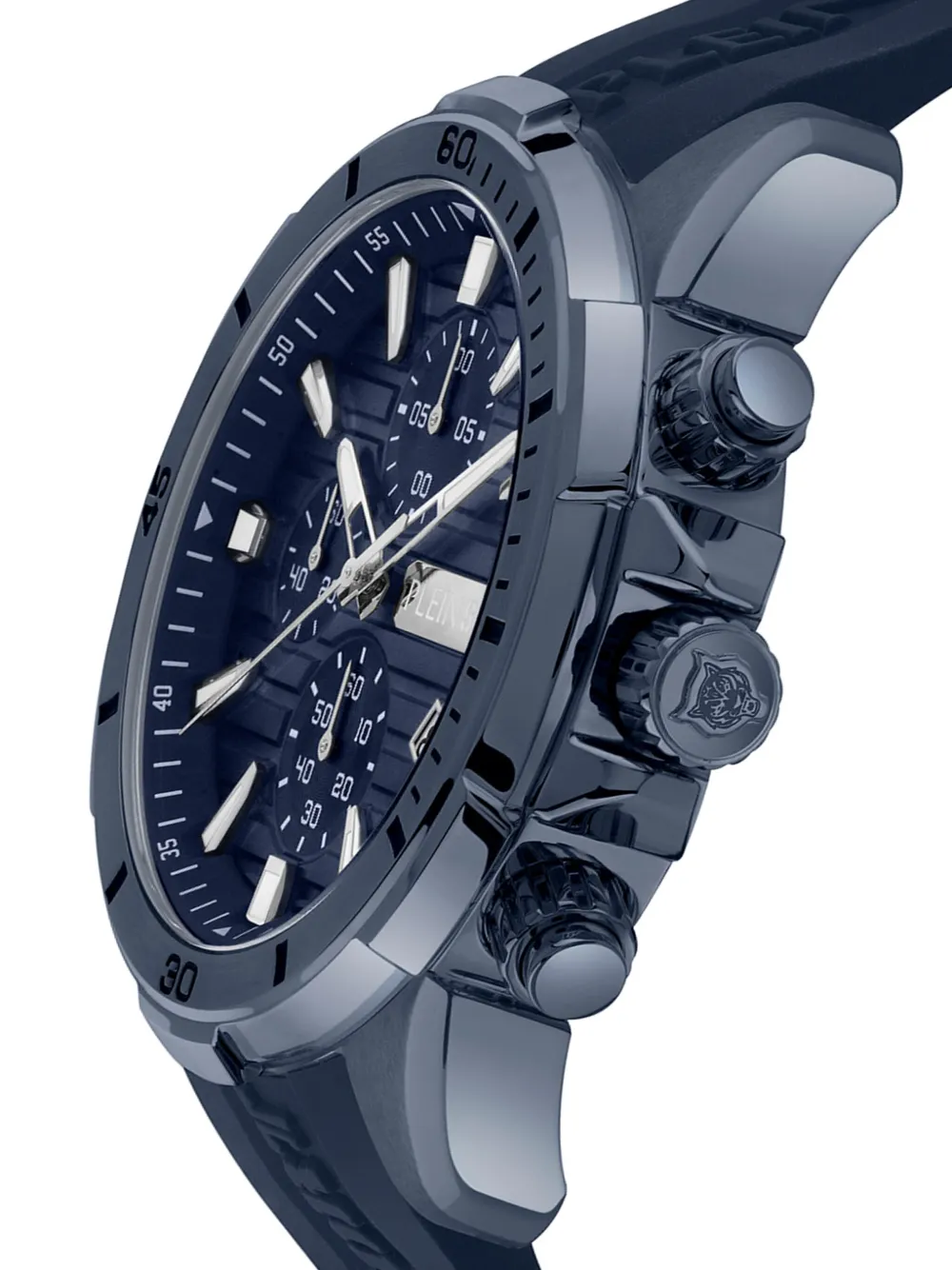 46mm roestvrij stalen horlogekast quartz uurwerk ronde wijzerplaat geometrische wijzerplaat datumaanduiding stopwatchfunctie geschroefde kroon twee chronografische drukkers siliconen armband gespsluiting Dit item wordt bezorgd met standaard twee jaar garantie van het merk.