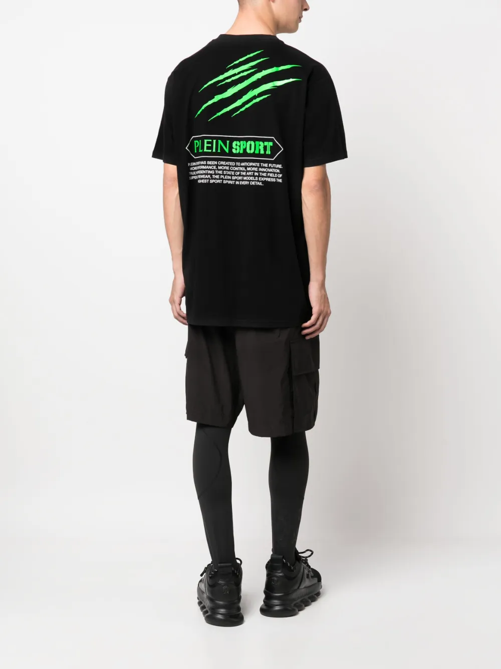 Zwart, fluorescerend groen, logopatch aan de voorkant, logoprint op de achterkant, ronde hals, korte mouwen en rechte zoom.