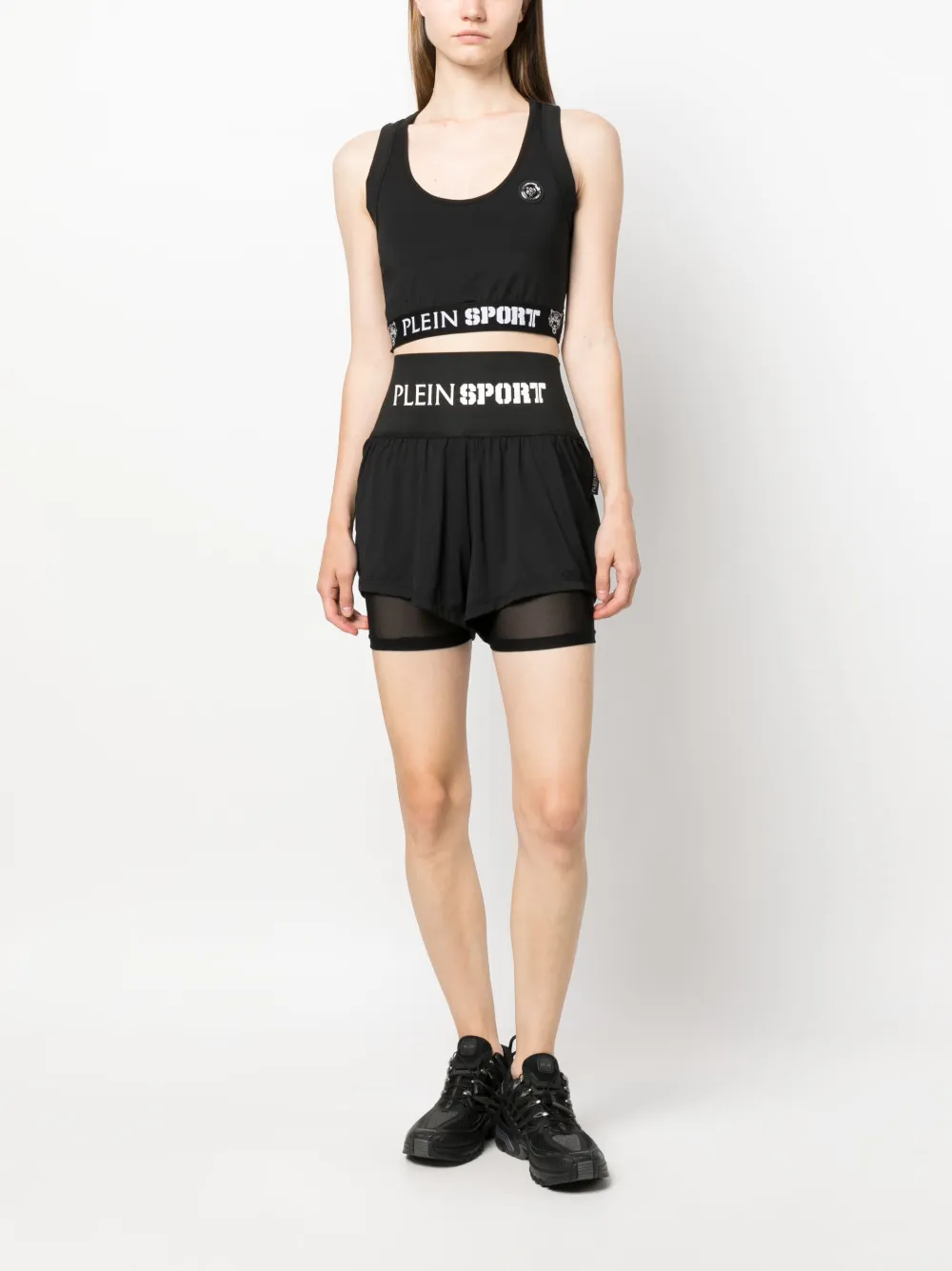 Zwart, katoen, effen logoplakkaat, band met logo, open rug, ronde hals, mouwloos en elastische zoom.