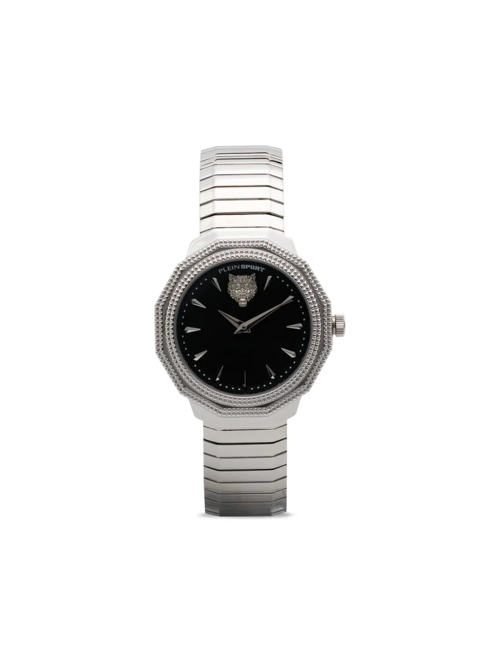 boîtier en acier inoxydable mouvement à quartz argenté cadran guilloché aiguilles glaives motif tête de tigre signature boîtier octogonal lunette cannelée couronne vissée bracelet en acier inoxydable boucle déployante à logo gravé étanche jusqu’à 50 m/5 ATM Cet article bénéficie d’un an de garantie standard proposé par la boutique partenaire.