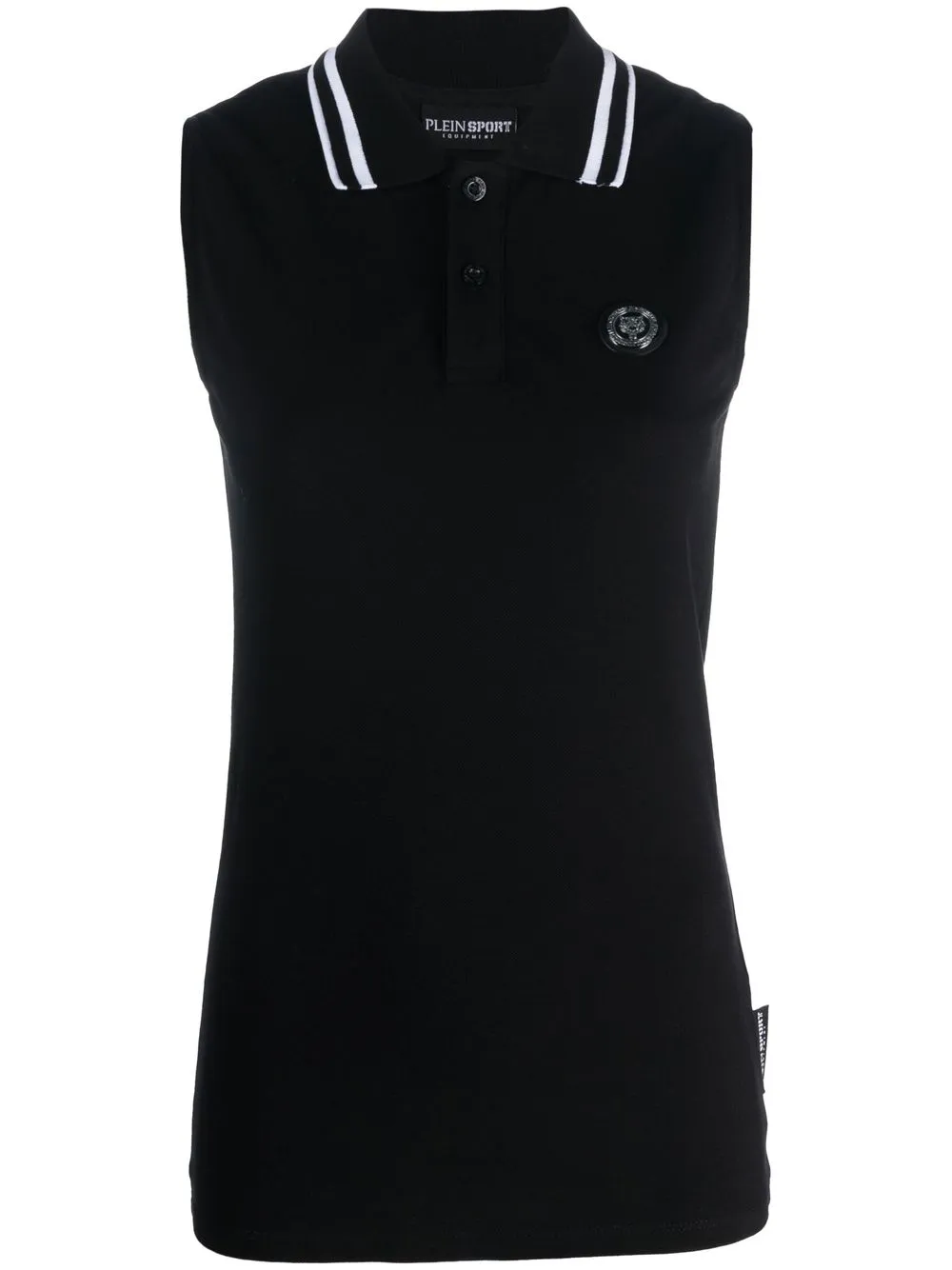 Noir, coton, patch poitrine à logo, logo imprimé à l’arrière, col polo, design sans manches, ourlet droit.