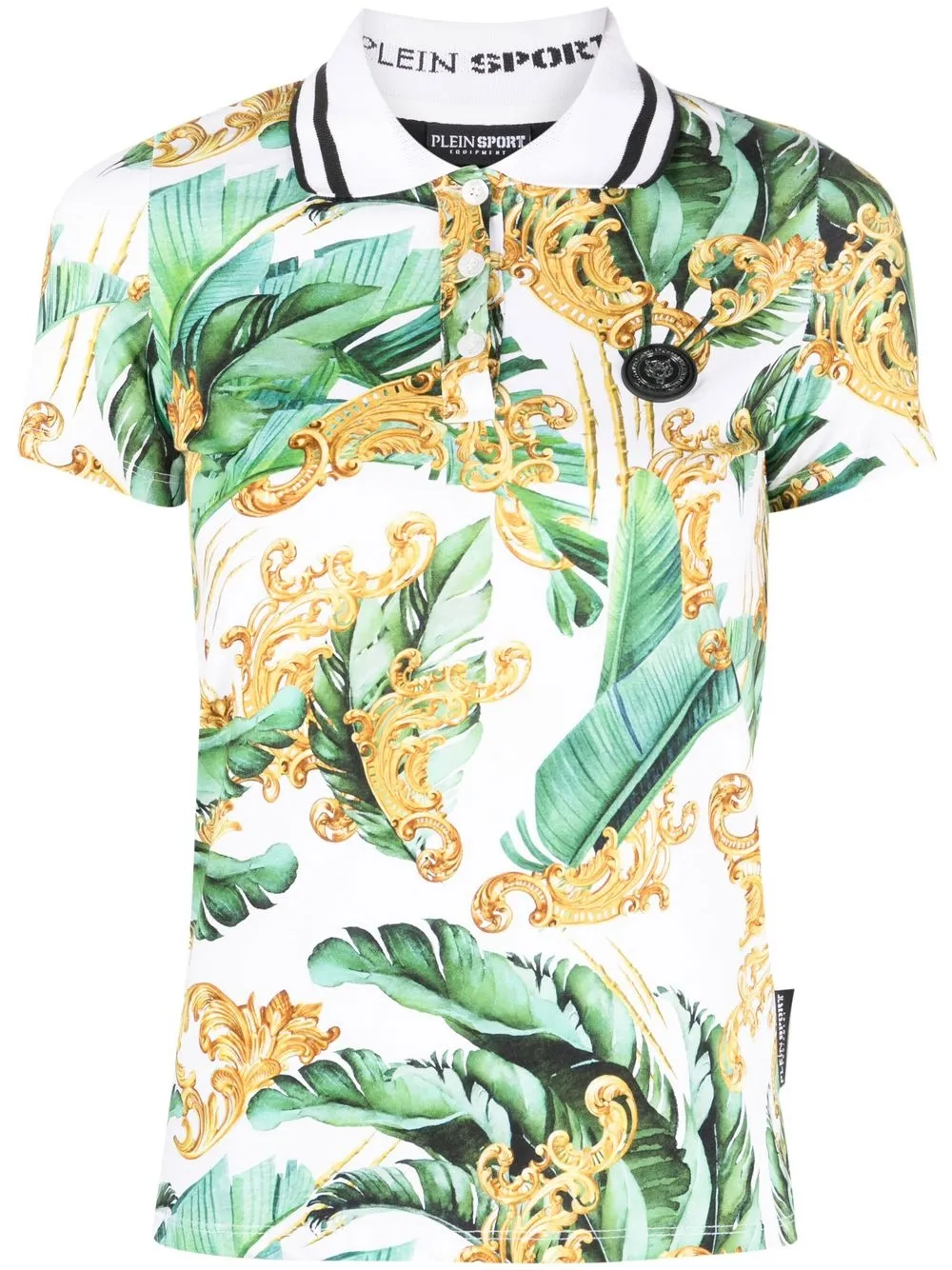 Blanc/multicolore, motif de fleurs, plaque logo, boutonnière sur le devant, col polo, bordures rayées, logo imprimé à l’arrière, manches courtes, ourlet droit.