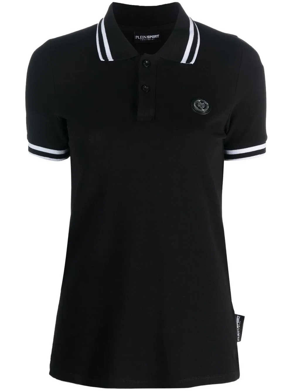 Noir, coton, bordure rayée, patch poitrine à logo, col polo, manches courtes, ourlet droit.