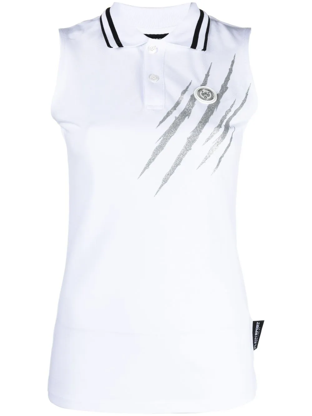 Argenté, coton, tissage piqué, patch poitrine à logo, fini métallisé, bordure rayée, col polo, boutonnière sur le devant, design sans manches.