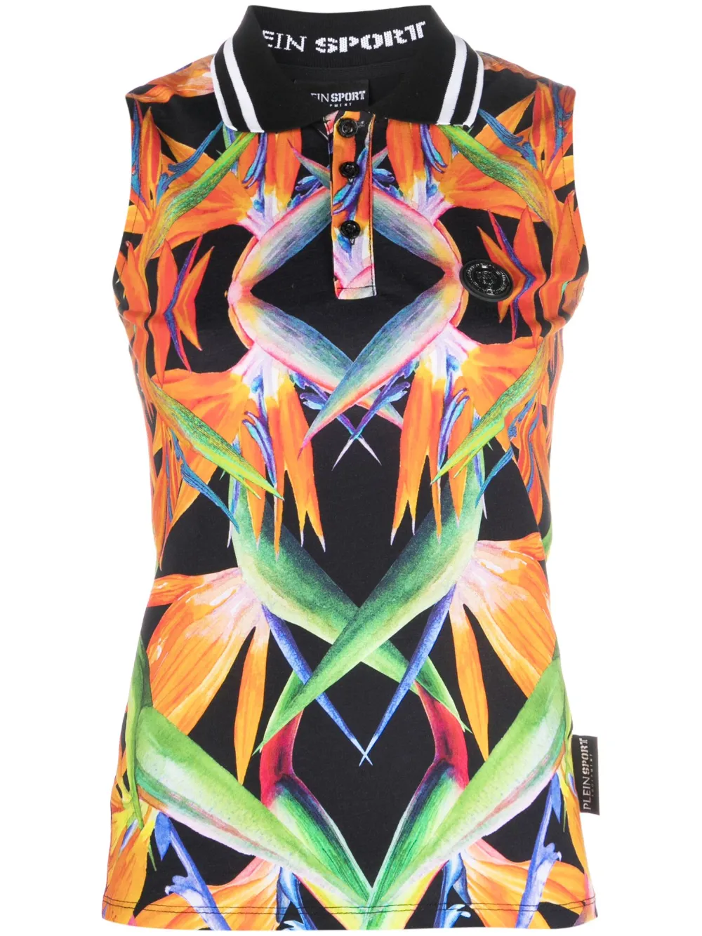 Noir/multicolore, coton, motif de fleurs, plaque logo, logo imprimé à l’arrière, patch logo sur le côté, détails rayés, col polo, patte de boutonnage sur le devant, design sans manches, ourlet droit.