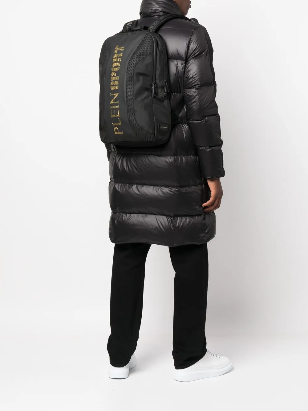 Gitzwart, goudkleurig logo, enkel plat handvat, twee verstelbare schouderbanden, ritssluiting aan de bovenzijde, hoofdvak en vak aan binnenkant.