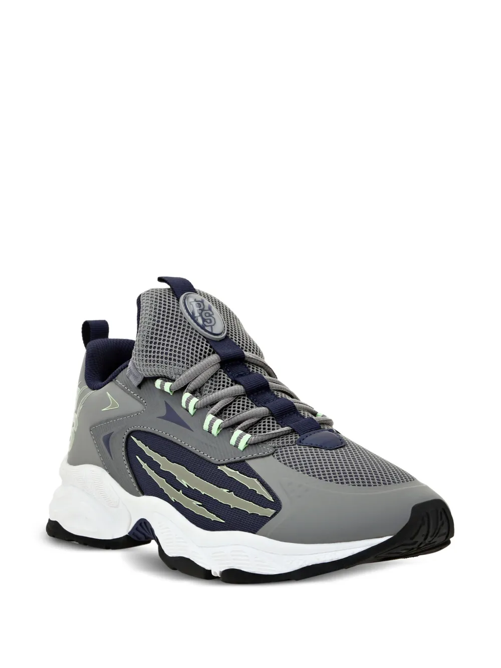 grijs vlakken mesh vlakken logoprint aan de zijkant logopatch op de tong lus op de hiel ronde neus veters aan voorkant binnenzool met logo chunky rubberen zool
