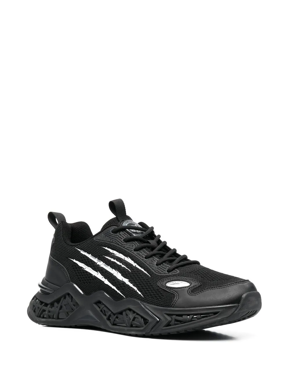 Zwart, design met vlakken, mesh vlak, logopatch op de tong , dubbel lipje bij de opening, vetersluiting aan de voorkant, ronde neus en platte rubberen zool. Als je dit uniseks item wilt kopen, wees ervan bewust dat het matensysteem voor heren wordt gebruikt..