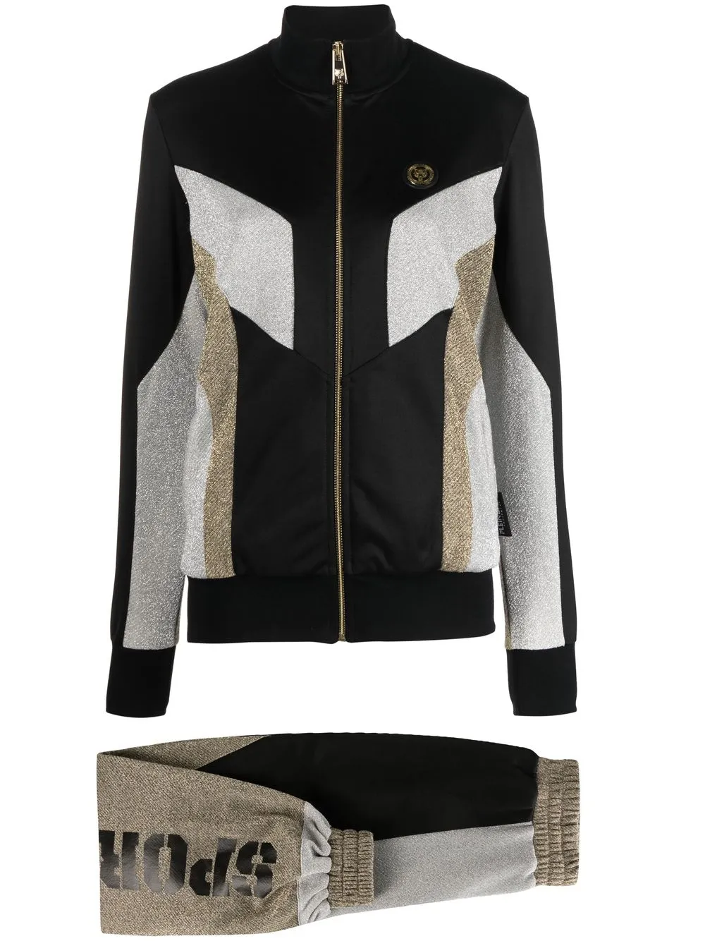 Noir, argenté, doré, coton mélangé, fini métallisé, design à empiècements, plaque logo, structure légère, fermeture zippée devant, manches longues, chevilles élastiques, ceinture élastique, logo imprimé sur la cuisse, design à empiècements, fini métallisé.