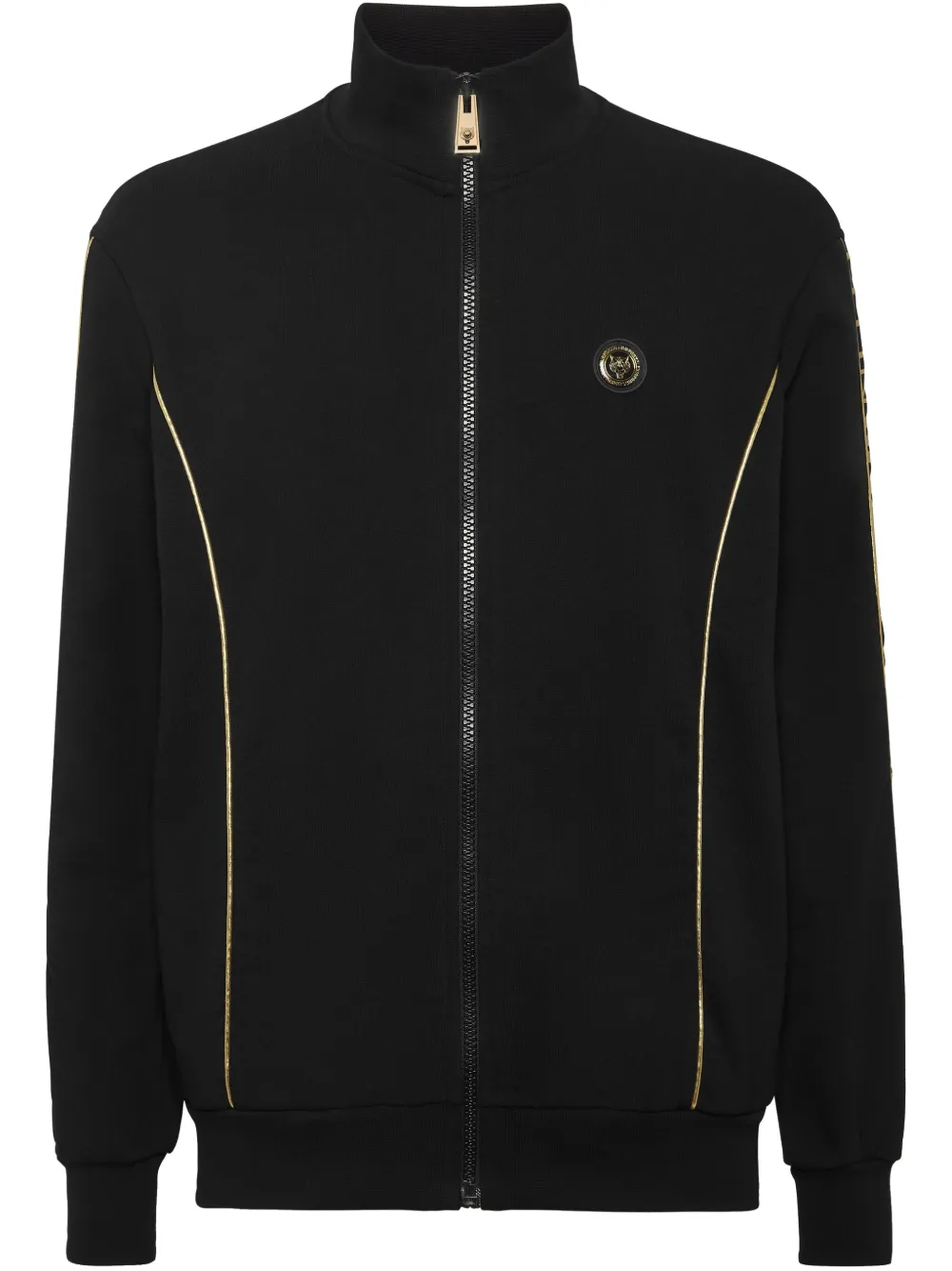 noir fermeture zippée devant patch poitrine à logo logo doré ourlet et bords nervurés