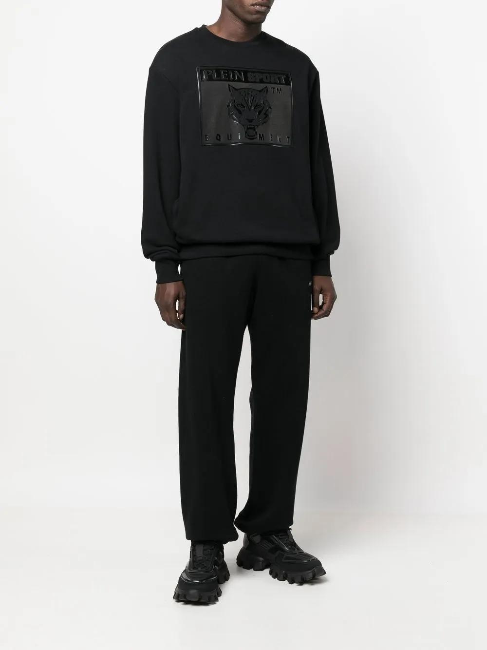 Gitzwart, logoprint op de borst, ronde hals, lange mouwen en rechte zoom.