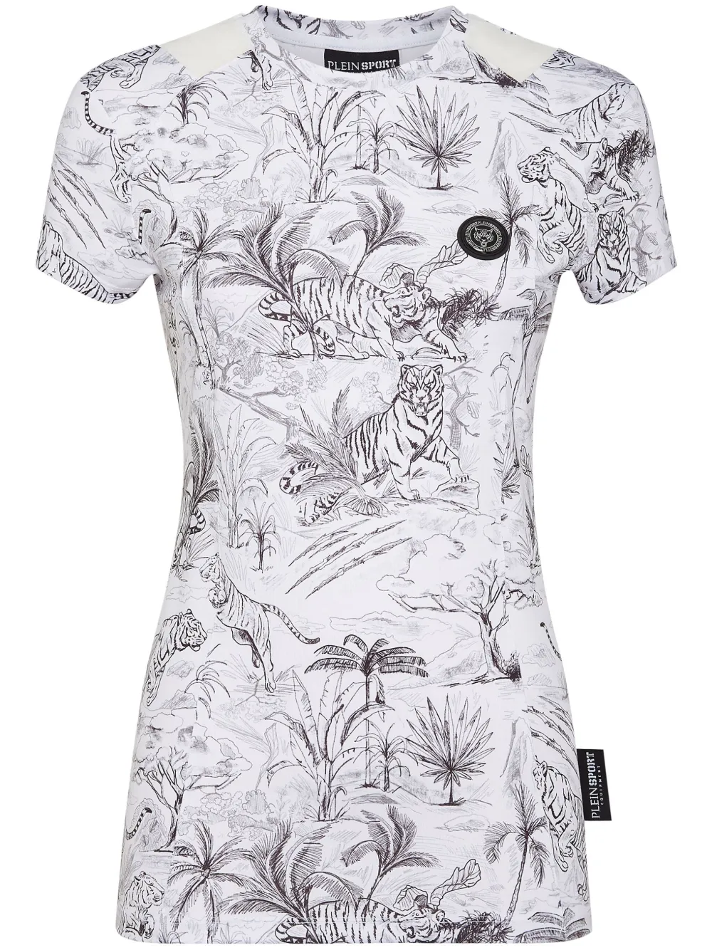 blanc/noir jersey stretch design à empiècements empiècements semi-transparents imprimé graphique intégral plaque logo argentée logo imprimé à l’arrière col rond manches courtes ourlet droit
