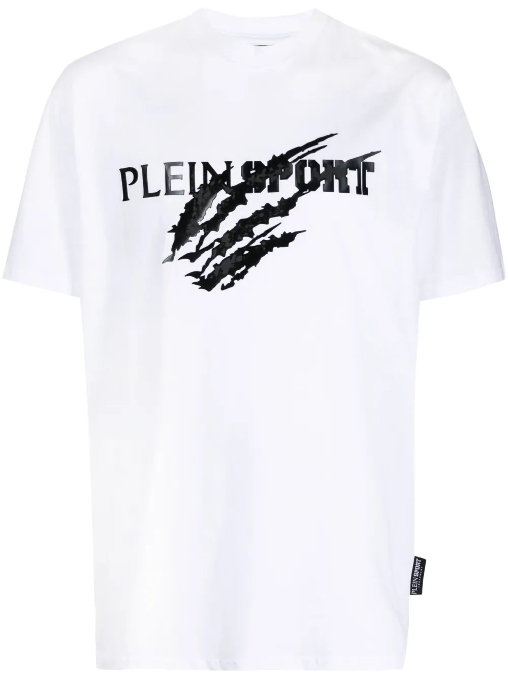 Blanc, logo imprimé à la poitrine, encolure ras du cou, manches courtes, ourlet droit.