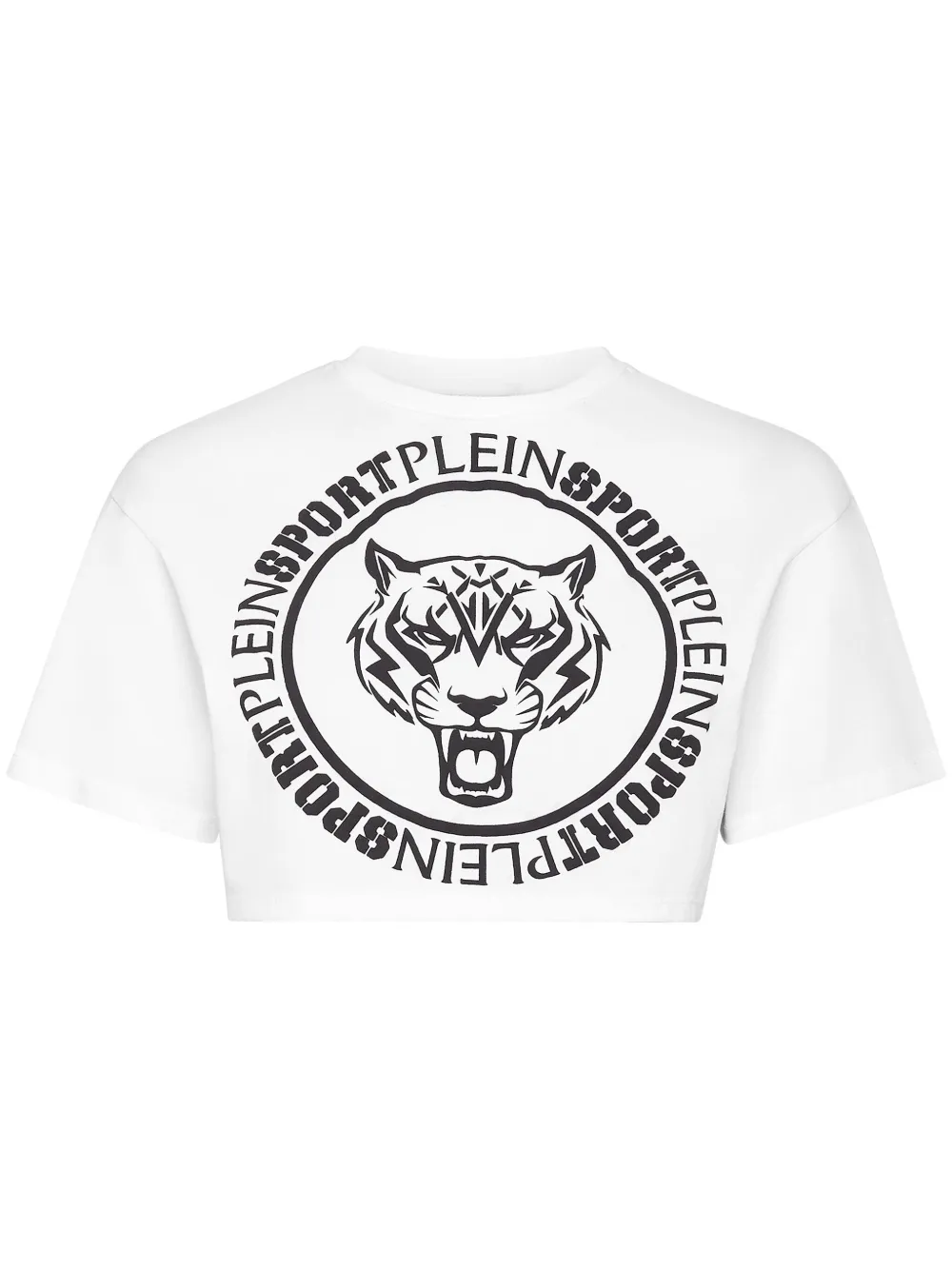 blanc/noir jersey stretch logo imprimé sur le devant col rond épaules tombantes manches courtes coupe crop ourlet droit