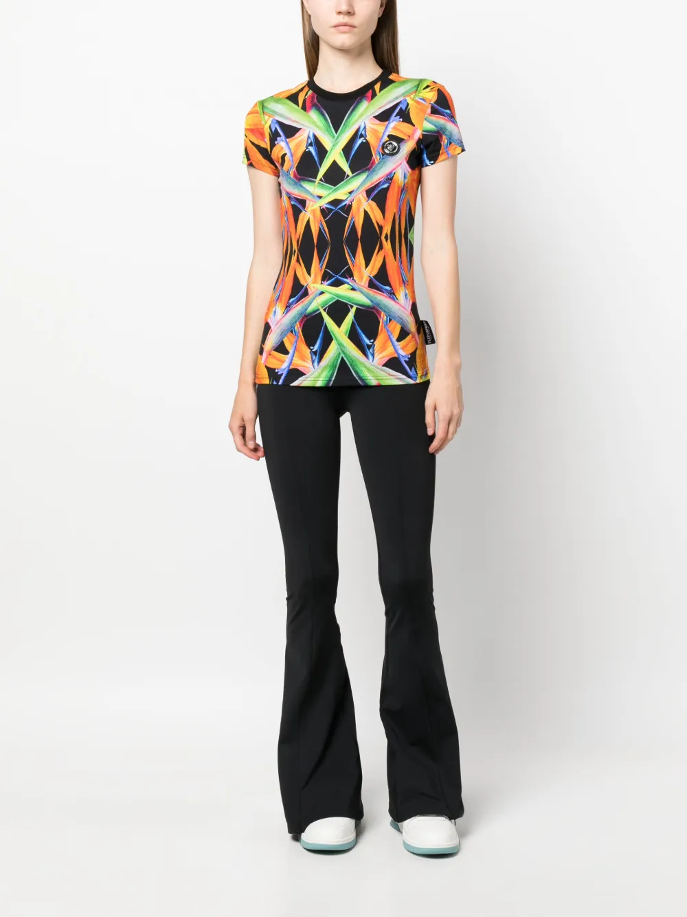 Zwart/veelkleurig, katoen, all-over bloemenprint, logo plakkaat, logopatch aan de achterkant, ronde hals, korte mouwen en rechte zoom.