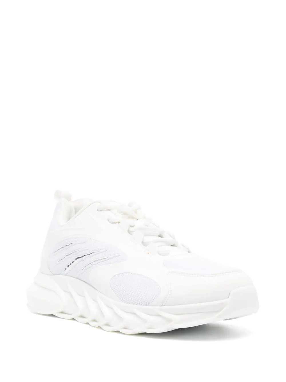 Wit, design met vlakken, mesh vlak, logopatch op de tong , ronde neus, vetersluiting aan de voorkant, dubbele ritssluiting bij de hiel en reliëf detail.