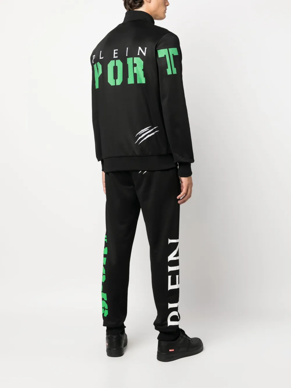 Gitzwart, katoen, logopatch aan de voorkant, logoprint op de achterkant, opstaande kraag, ritssluiting aan de voorzijde, lange mouwen, geribbelde manchetten, logoprint op de pijpen, trekkoordsluiting bij de taille en geribbelde zoom.